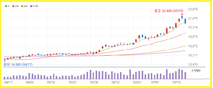 현재 주가는 최근 52주 최고가 22,400원 대비 소폭 하락했으나, 20,000원대 초반에서 지지선을 형성하는 모습입니다. 단기 이동평균선은 하락세이나, 중장기적으로는 안정적인 흐름을 보이고 있어 반등 가능성도 열려 있습니다.