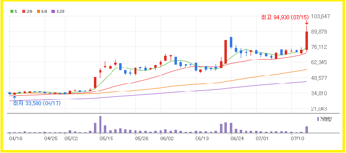 투자자별 매매동향을 보면 외국인과 기관이 꾸준히 매수세를 유지 중이며, 특히 외국인 보유율은 4.13%로 아직 확대 여지가 있습니다. 거래량과 거래대금도 크게 증가해 시장의 관심이 집중되고 있음을 알 수 있습니다.