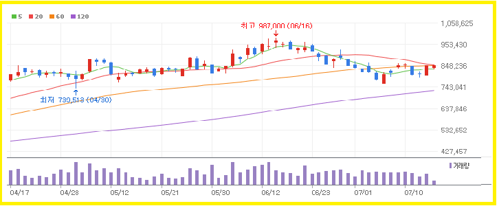 손절 기준은 최근 저가인 830,000원 이하로 설정하는 것이 바람직하며, 800,000원 부근은 중대한 경계 구간으로, 이탈 시 추가 하락 가능성을 경계해야 합니다.