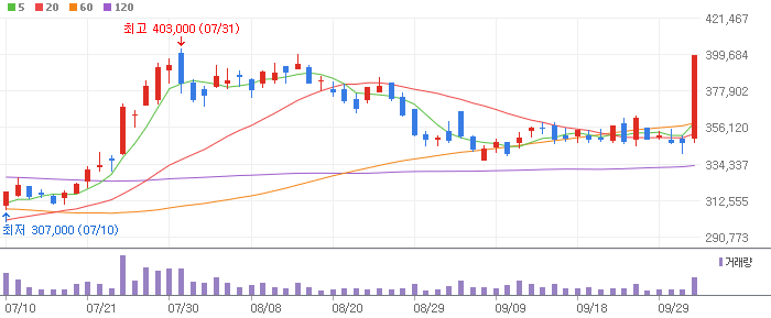 오늘 주가는 전일 대비 51,500원 상승하며 399,000원으로 마감했습니다. 이는 전일가 347,500원에 비해 약 14.82% 상승한 수치입니다. 오늘의 거래량은 445,538주로, 거래대금은 165,859백만 원에 달했습니다.
